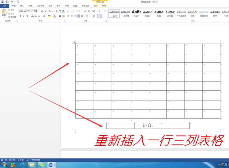 6、确定班级座位形式后,根据要求调整表格的位置。如果班里有调皮捣蛋的可以在讲桌两旁设置两个座位。一张简单的班级座位表就制作好了。
