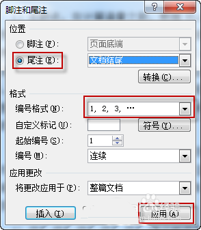 2、点击向下的箭头进行脚注和尾注设置,位置选尾注,编码格式选择数字编码1,2,3格式