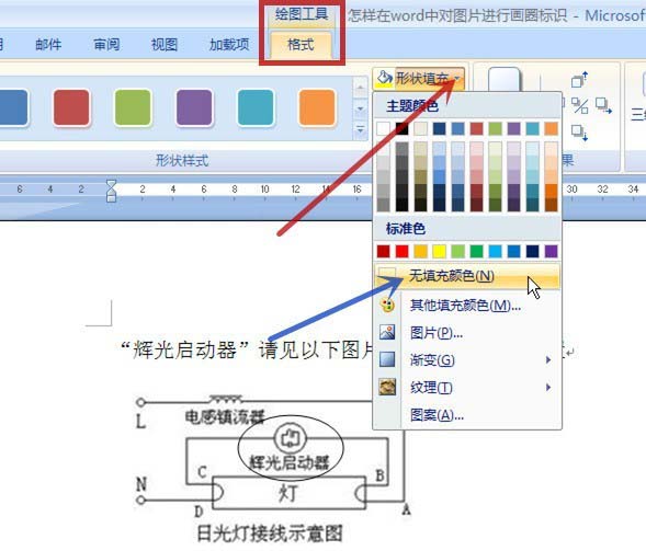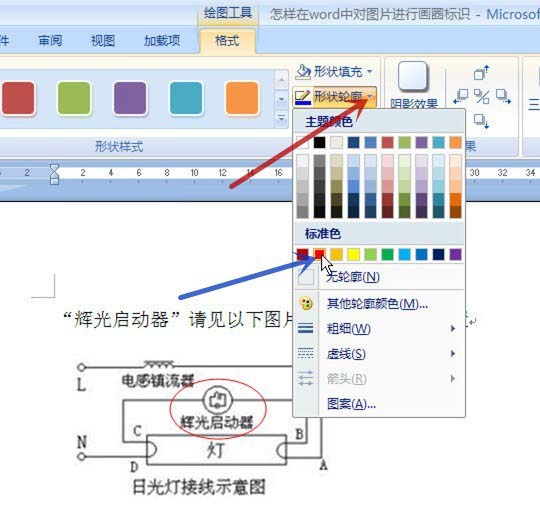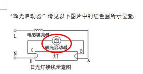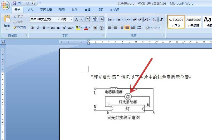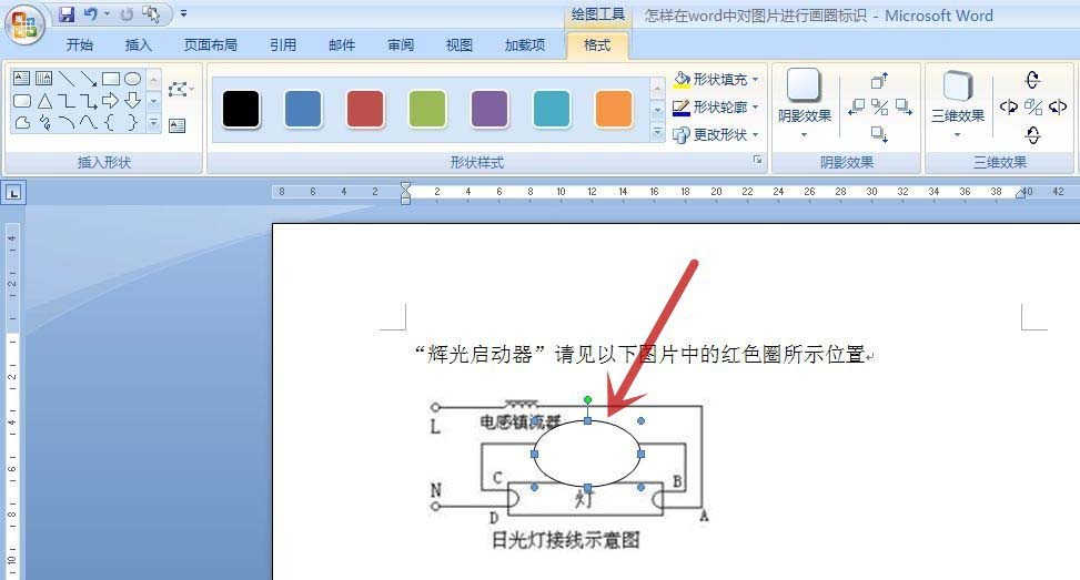 1、打开一个示例的文档,文档内含有文字及图片,准备在图片中的"辉光启动器"(图中红色箭头所指)加上一个红色的圆圈作为示例