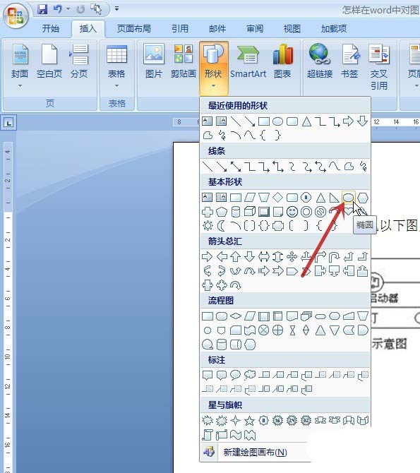 3、在弹出的菜单中点击"椭圆"(图中红色箭头所指),当然也可以点击其它你想要的形状