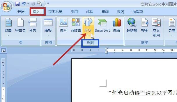 2、点击顶端的"插入"选项卡(图中红框),再点击"插图"选项组(图中蓝框)中的"形状"命令(图中红色箭头所指)