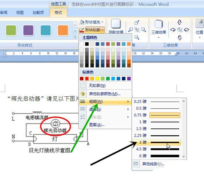 6、再点击"形状轮廓"旁的下拉三角形(图中红色箭头所指),在弹出的菜单中点击"红色"(图中蓝色箭头所指),文档中的圈会实时显示,若觉得线不够粗,可点击"粗细"(图中绿色箭头所指),在弹出菜单中点击想要的线粗,这里选"3磅"(图中黑色箭头所指)为例