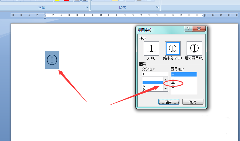 5、选中这个圆圈感叹号,然后在带圈字符小框里点击选择圈号里的 小三角图形,如下图