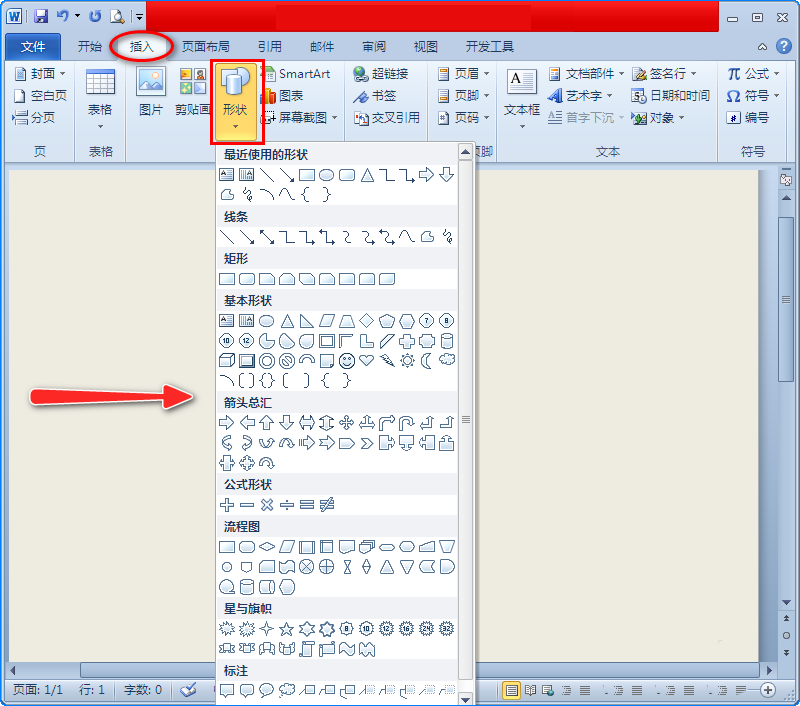 1、打开word软件,我们新建一个空白文档。在主菜单栏中单击"插入"选项,并在其下拉菜单中单击"形状"子项,这时会出现扩展项。如图所示: