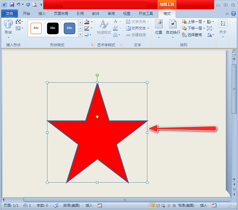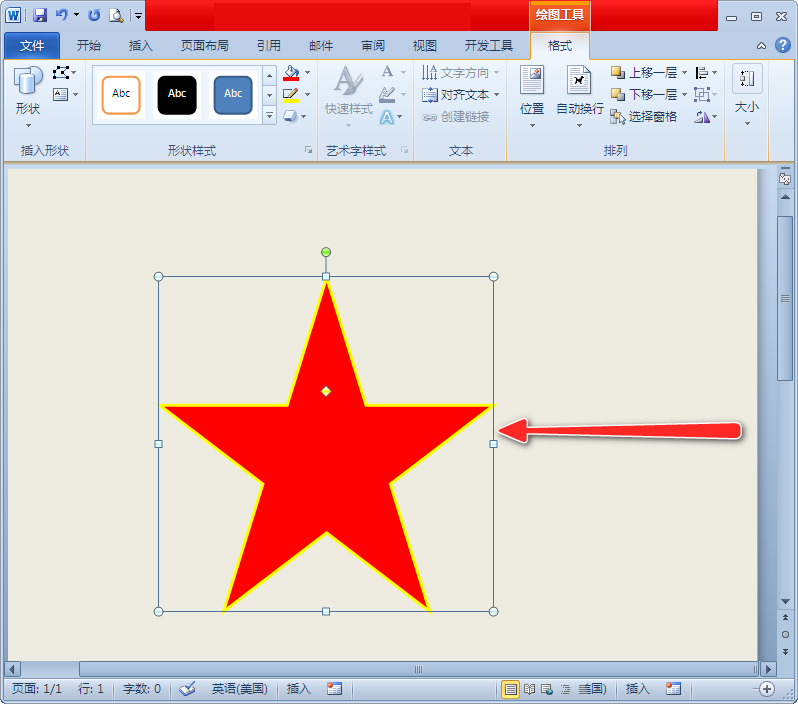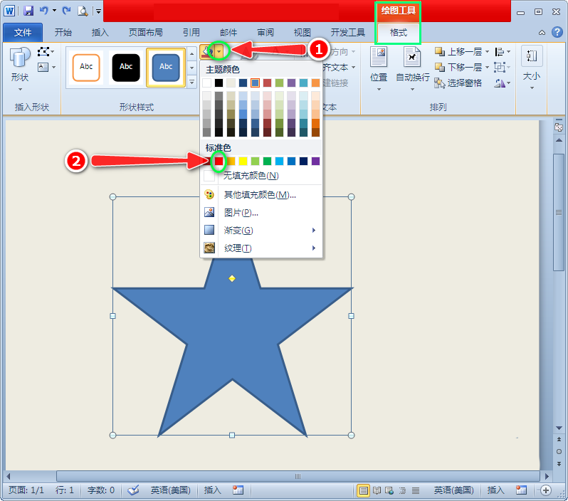 4、对于给小朋友看的图案,建议图案的颜色能丰富些,下面我们就开始给"五角星"增加颜色吧。在"绘图工具"的"格式"子菜单中,我们单击"形状填充"子项右侧的下三角符号,在出现的颜色扩展项中选择一种填充颜色,比如"红色"。如图所示: