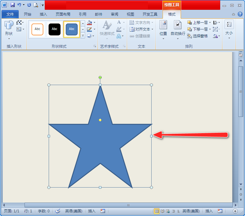 3、鼠标移至空白文档处后,我们按住键盘上的"Shift"键不放,同时按住鼠标左键拖动,拖动的距离越远,五角星图案就越大。如果觉得图案大小适合了,松开"Shift"键和鼠标左键即可得到一个"五角星"图案。还有按住"Shift"键是为了确保五角星是个"正五角星"。如图所示: