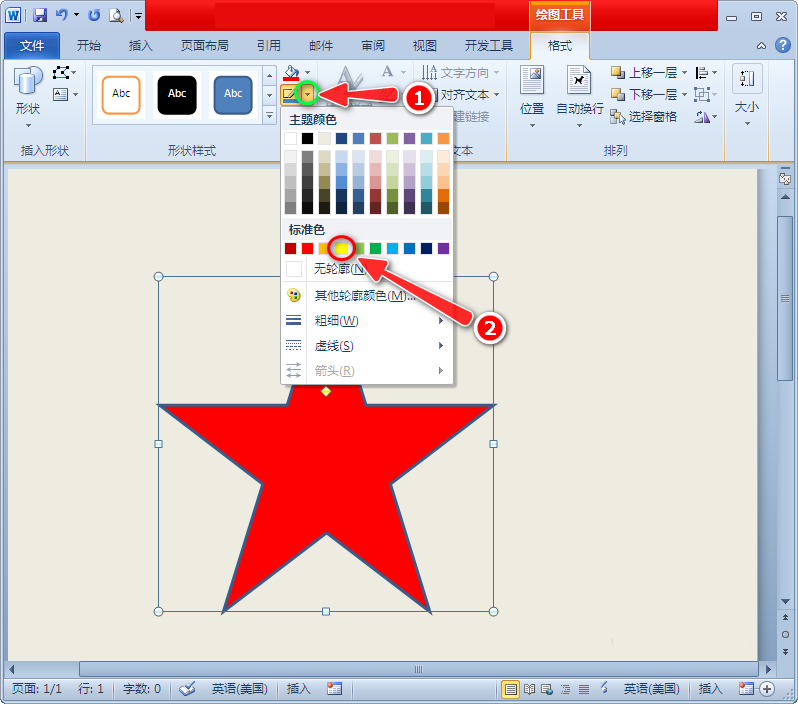 5、"五角星"的内部颜色填充好了,现在我们也给其外部的轮廓换一种颜色。单击"形状轮廓"子项右侧的下三角符号,在出现的各种颜色中选择一个,比如"黄色",这样我们的"五角星"就画好了。如图所示: