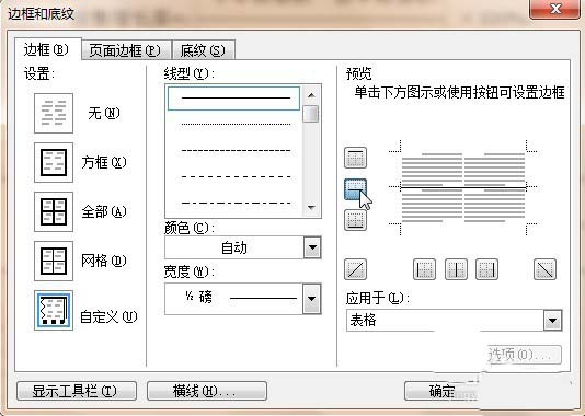 在弹出的"边框和底纹"窗口中的"边框"选项设置中,点击"无"的图标→在预览区域的左侧点击应用于单元格之间的横线→点击"确定"。