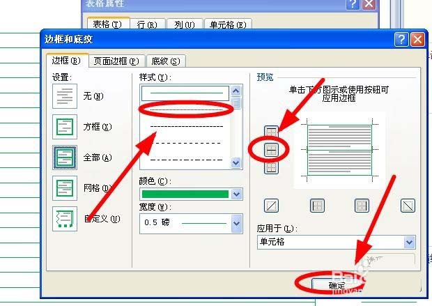 10、在"边框"选项卡中,先单击"预览"部分的"表内横线"取消恒先后,再单击"样式"中的"虚线",预览部分选中"表格内横线",然后单击"确定"