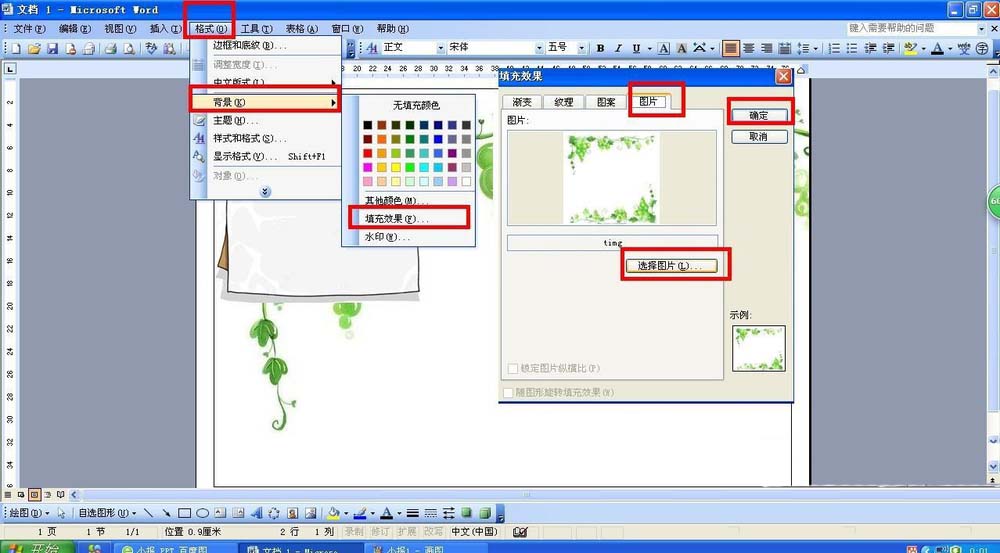 2、设置小报雅背景图片后点击确定。背景一般有一些花边,但最好大部分底色是白色或浅白色。