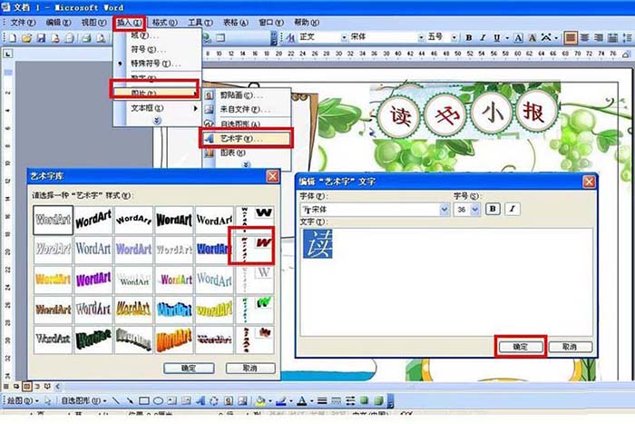 4、设置小报主题。点击插入——图片——艺术字——选择一种艺术类型输入文字,如这里分别写上读书小报四个艺术字摆放在四个小圆那里。