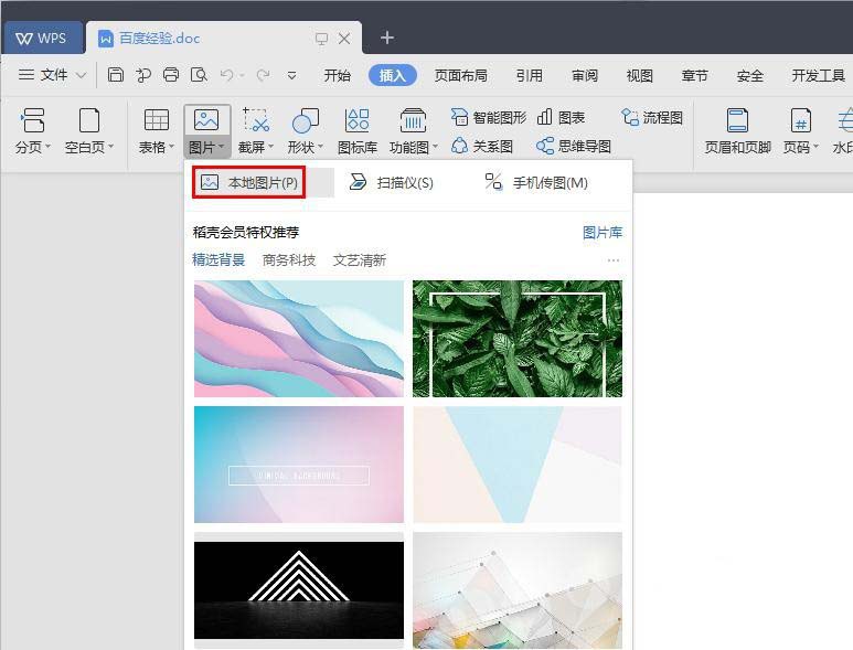 打开一个需要将图片居中显示的wps文档,单击菜单栏"插入"中的"图片--本地图片"。