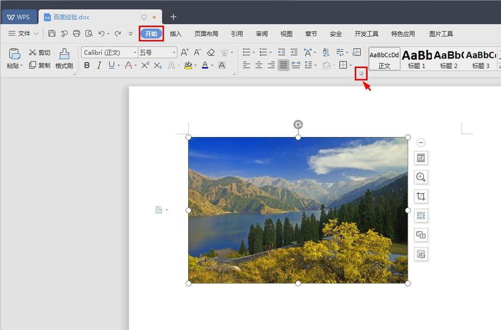 1、选中要居中显示的图片,单击菜单栏"开始"中红色方框标记的按钮。