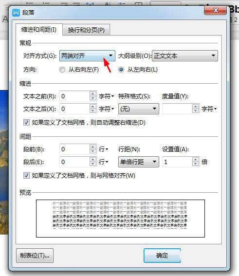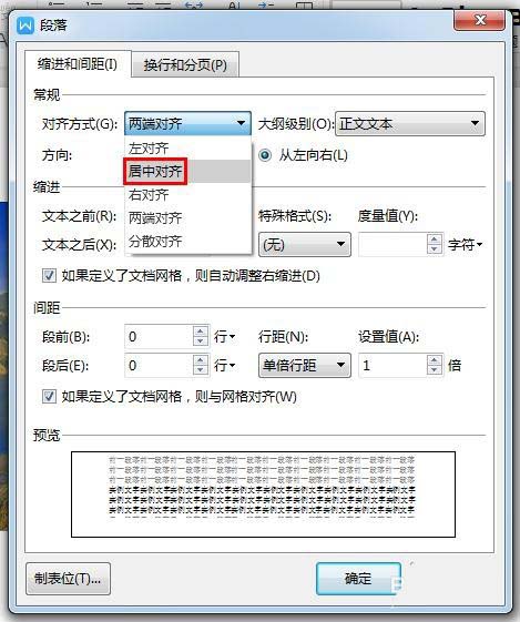 2、在弹出的"段落"对话框中,单击红色箭头标记的位置,选中"居中对齐"。