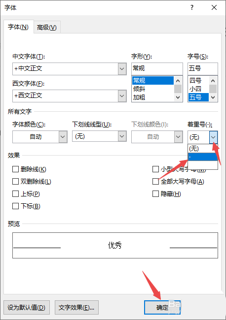 5、之后点击着重号边上的下拉箭头,之后选中着重号,然后点击确定;