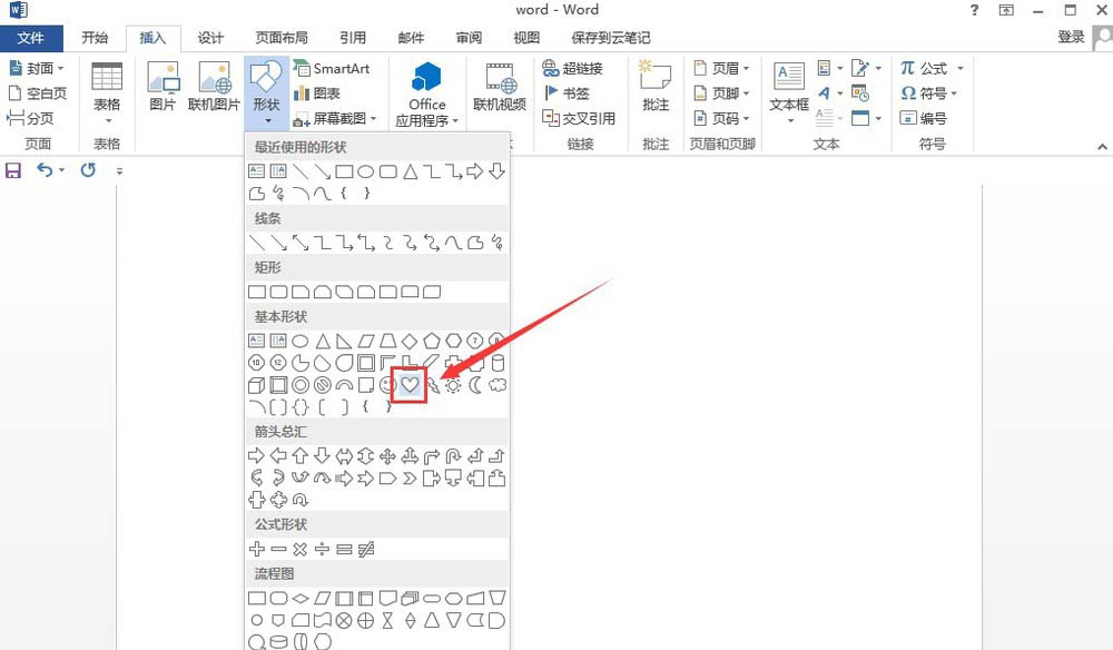 1、点击"插入"——"形状"——"心形"