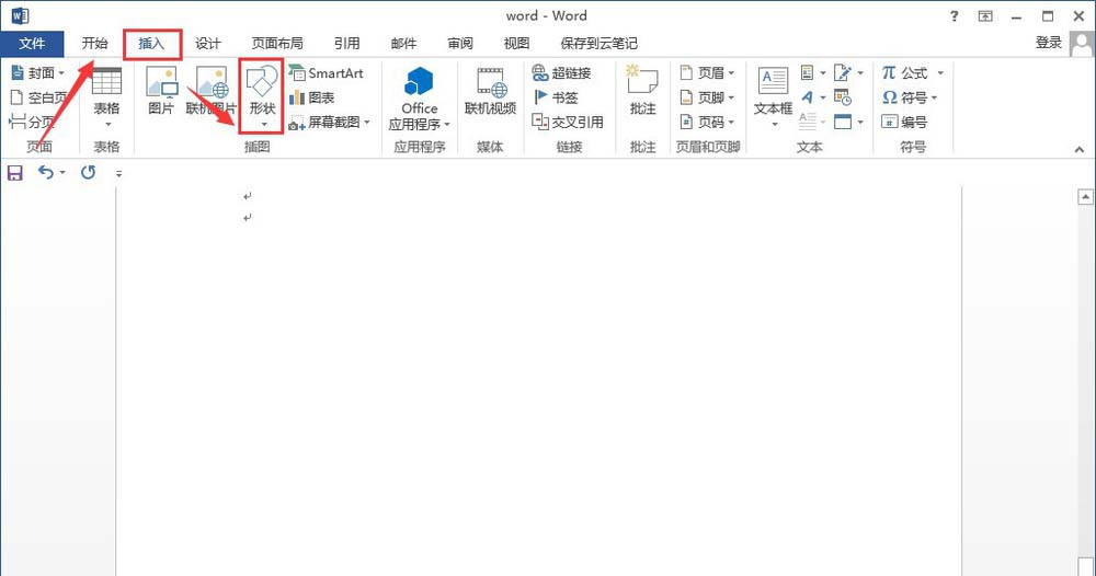 1、进入word文档首页,点击菜单栏处的"插入"按钮,然后在插入的任务栏中选择"形状"。