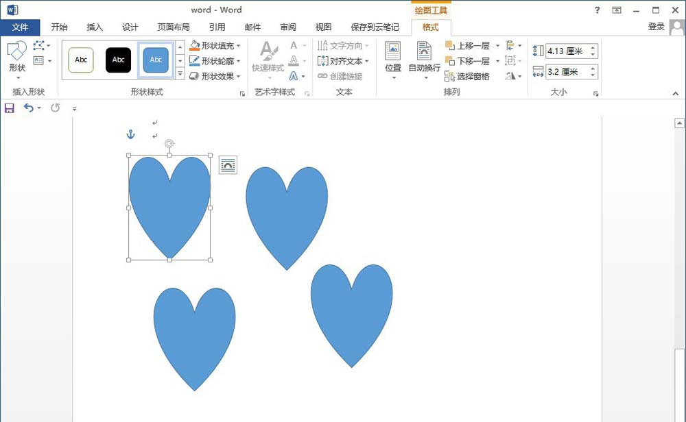 4、选中刚画的心形形状,按快捷键Ctrl + c 复制,然后按快捷键Ctrl + v粘贴,粘贴其他三个心形形状。