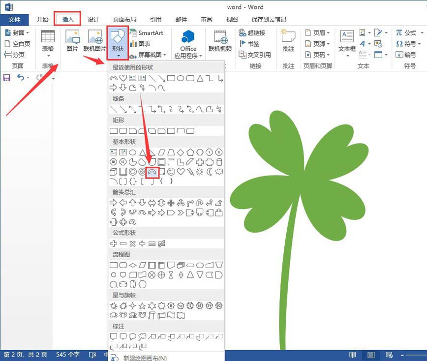 4、点击"插入"——"形状"——"弧形"画出四叶草的茎