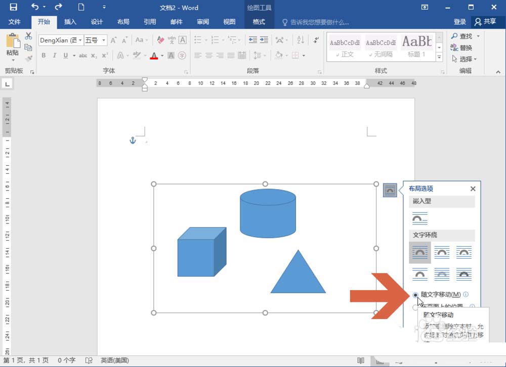 3、这时要想移动画布,可以点击选择除嵌入型之外的其他文字环绕选项。