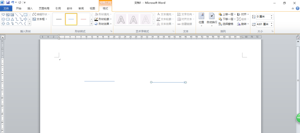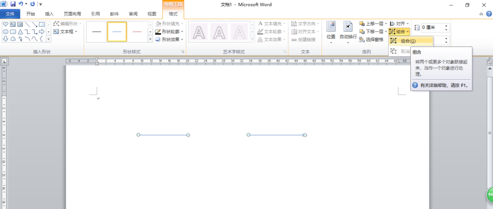 2、选中一条线条,按着Ctrl键再选中另一条线条, 单击"绘图工具"的"格式"选项卡,在"排列"组中单击"对齐"按钮,在下拉列表中选择"上下居中"。