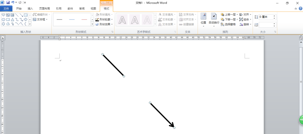 1、打开Word2010,从"形状"中按着shift键分别绘制一条直线,一条向右箭头。