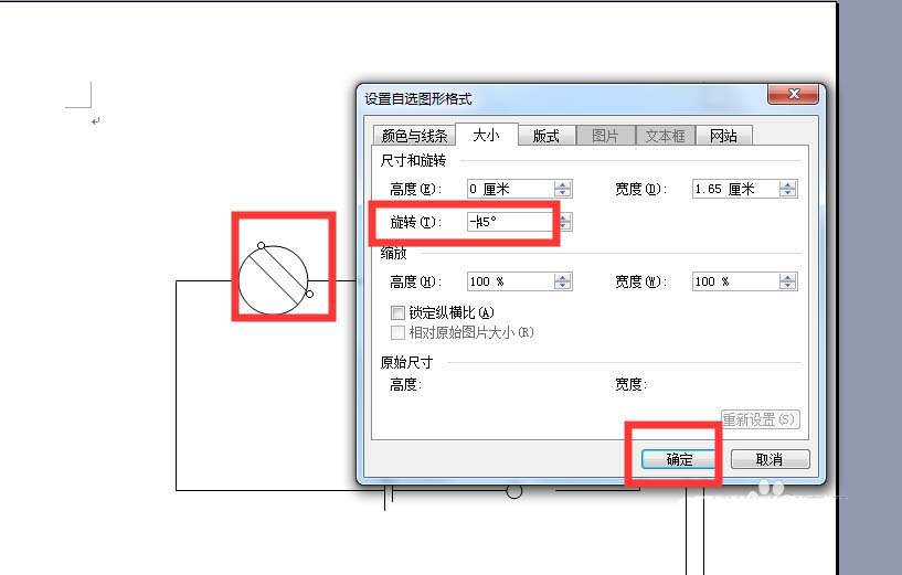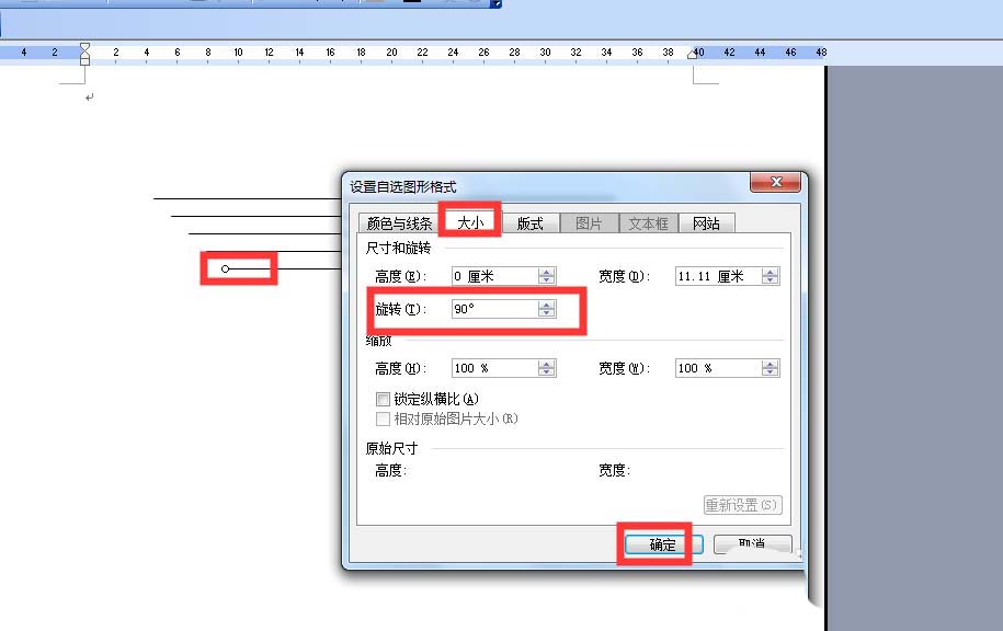 3、在其中一条直线上双击,弹出对话框,点击大小,旋转输入90度,确定。把直线转换方向。