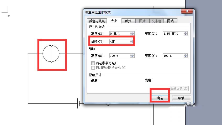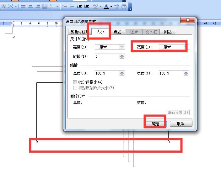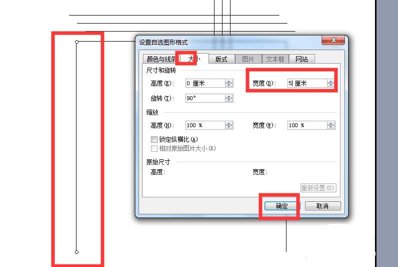 6、两边的竖线太长了,在其中一线竖线上双击,弹出对话框,点击大小,把宽度缩小,确定。因为我们是旋转的横线也有不是高度而是宽度。