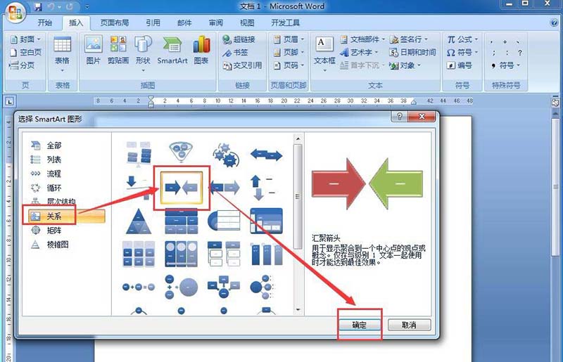 4、点击关系类别,找到并选中汇聚箭头,按确定;