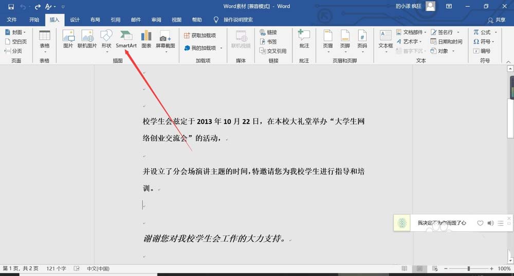3、点击插入,找到插入选项卡下面的插图功能组,在里面找到smartart图形,点击进入,如下图所示。