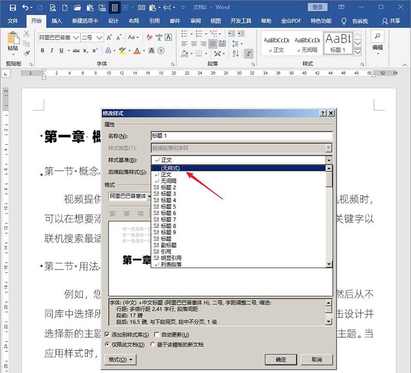 7、但是,如果每次都这么重复设置,不免麻烦,需要根除之。对某个样式执行修改样式,在样式基准中,默认该样式是基于正文样式。从这里就能发现为何标题1样式和标题2样式会随着正文样式而变化,就是因为标题1样式和标题2样式都是基于正文样式的。