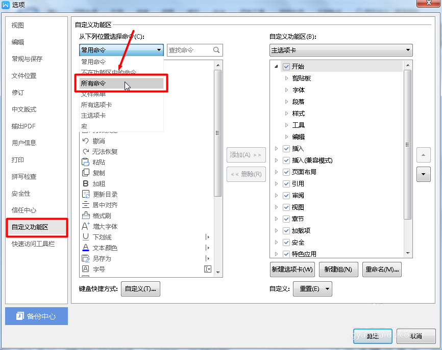 6、点开"选项"之后,找到"自定义功能区",选择所有命令,如图
