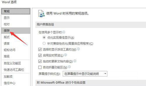 打开Word选项的对话框之后,点击左侧列表中的"保存",如图。