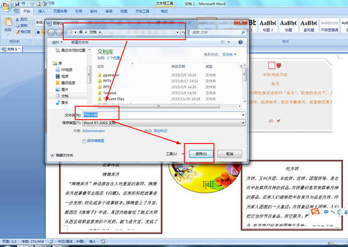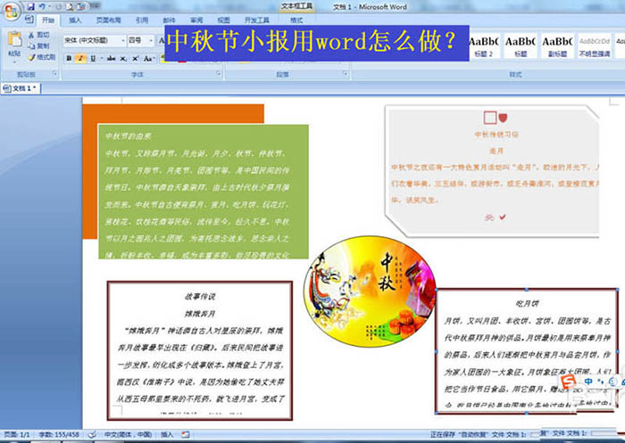 6、同样方法在左下角和右下角插入其它有关中秋节的小报板块,然后点击office按钮——保存,选择保存路径和命名后点击"保存"。