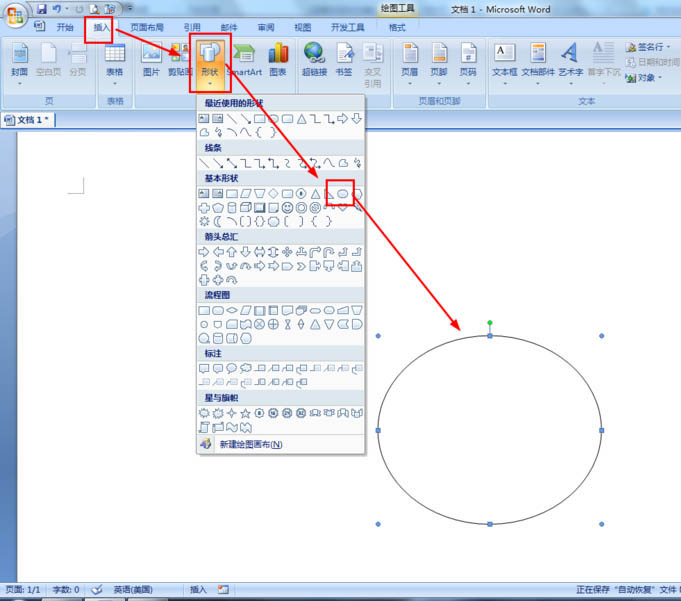2、接着点击插入——形状——选择圆形,在页面中间画一个正圆形。
