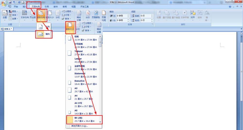 1、新建一个空白word文档——点击页面布局——纸张方向设置为横向,纸张大小设置了B4。