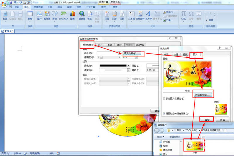 3、右击圆形——选择设置自选图形格式——颜色和线条——填充效果——图片——选择有关中秋节的图案并点击打开——点击两次确定。