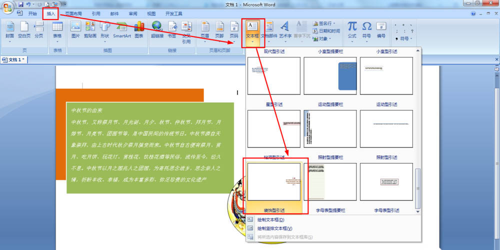 5、同样点击插入——文本框——选择装饰型引述文本框插入到编辑页面的右上角并输入有关中秋节传统习俗的内容。