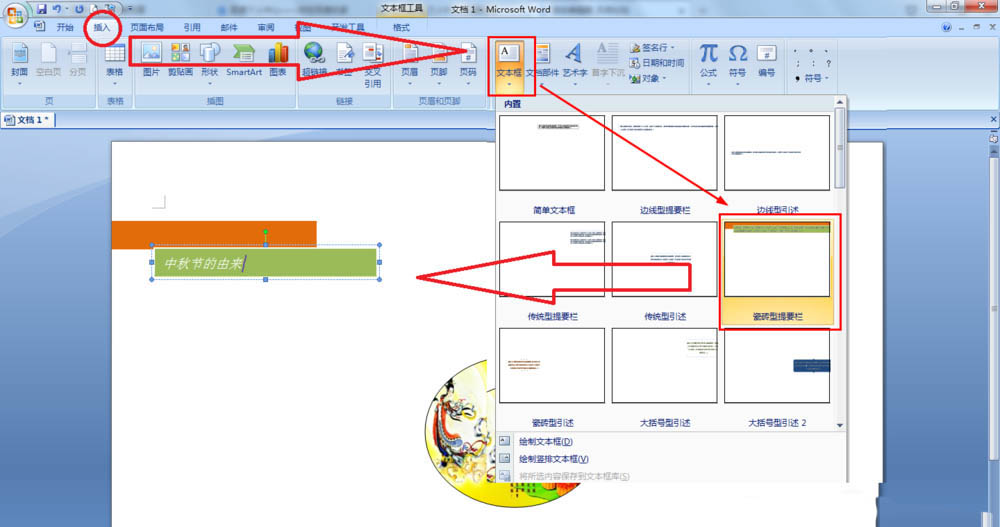 4、点击插入——文本框——选择瓷砖型提要栏——在编辑页面左上角插入这样的文本框,输入有关中秋节由来的内容。