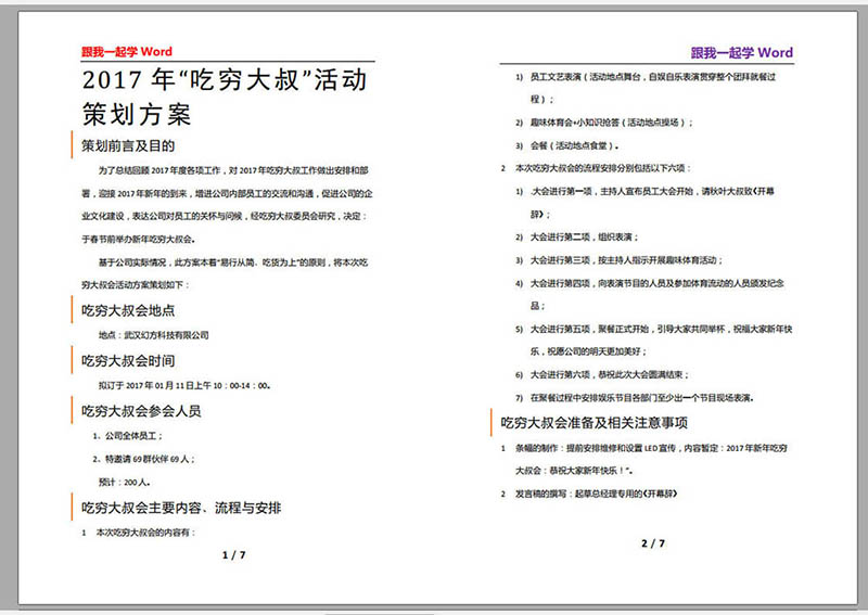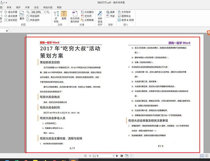 1、首先我们打开需要设置缩放打印的文档,我的文档总共有7页,下面我们设置缩放打印,让每一张Word页面上原本一版的内容变成一张Word页面打印两版内容,如图1