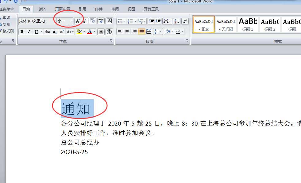 选中【通知】二字,然后再调大字体,不是固定值尽量大一些,醒目即可,如下图所示。