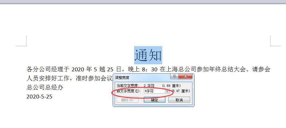 也可以打开调整宽度窗口,然后再输入新文字宽度,比如4字符,然后点击确定,如下图所示。