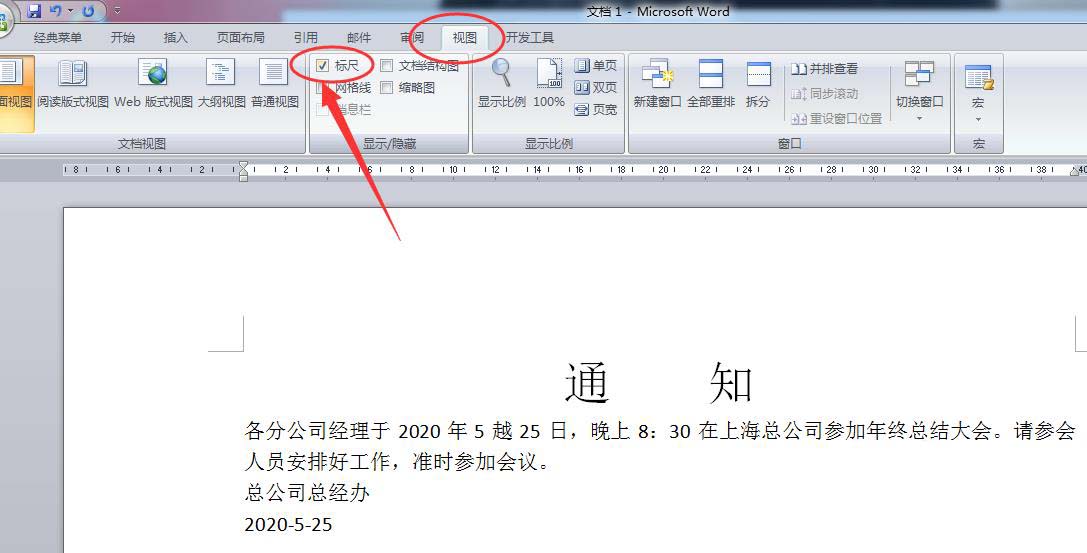 在视图选项卡,勾选显示标尺,如下图所示。