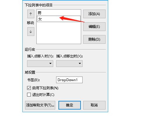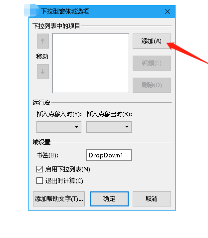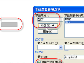 3、双击下拉型窗体,在"下拉型窗体域选项"窗口中,在"下拉项中输入"内容"后再点击"添加"按钮完成下拉列表。最后在下方勾选"启用下拉列表"。
