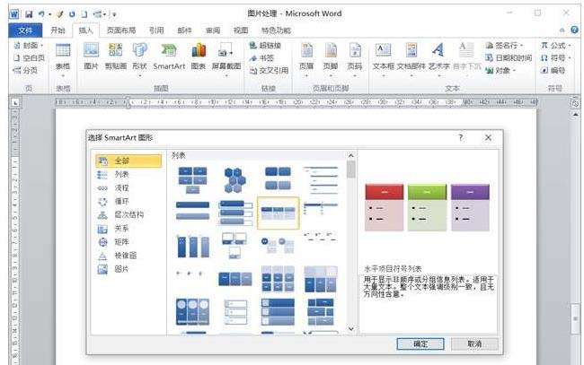 2、点击插入选项卡——插图组——SmartArt按钮。在跳出的对话框架中选择水平项目符号列表图。