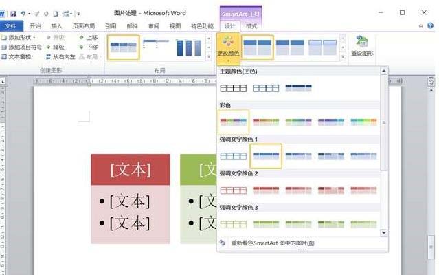 3、在编辑区出现一个水平项目符号列表图,需要对其进行一些处理,以更美观。在SmartArt 工具栏中选择设计院选项卡——样式组,选择自己的颜色