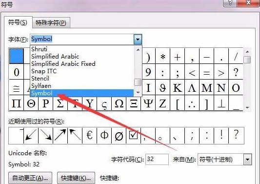 4、在符号窗口中我们点击"字体"下拉菜单,在弹出菜单中选择Symbol菜单项。