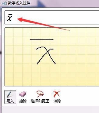4、这时会打开word的数学输入控件窗口,我们在这里用鼠标手工写一下X平均值的符号,然后上面会自动识别出X平均值符号,再点击插入按钮就可以了。
