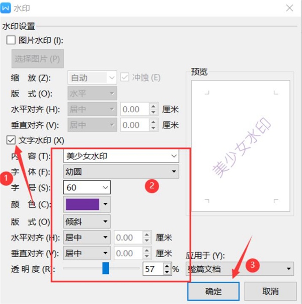 3.勾选设置文字水印,输入想要设置的内容,然后再调整格式,点击确定即可: