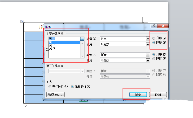 4、弹出对话框,选择主要关键字,排列顺序,确定。